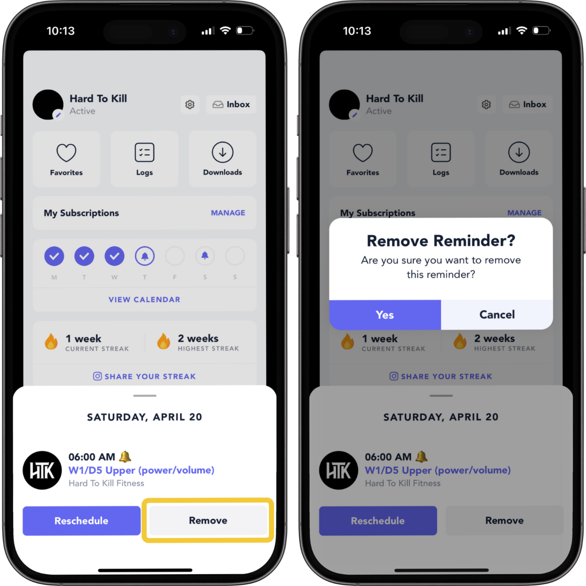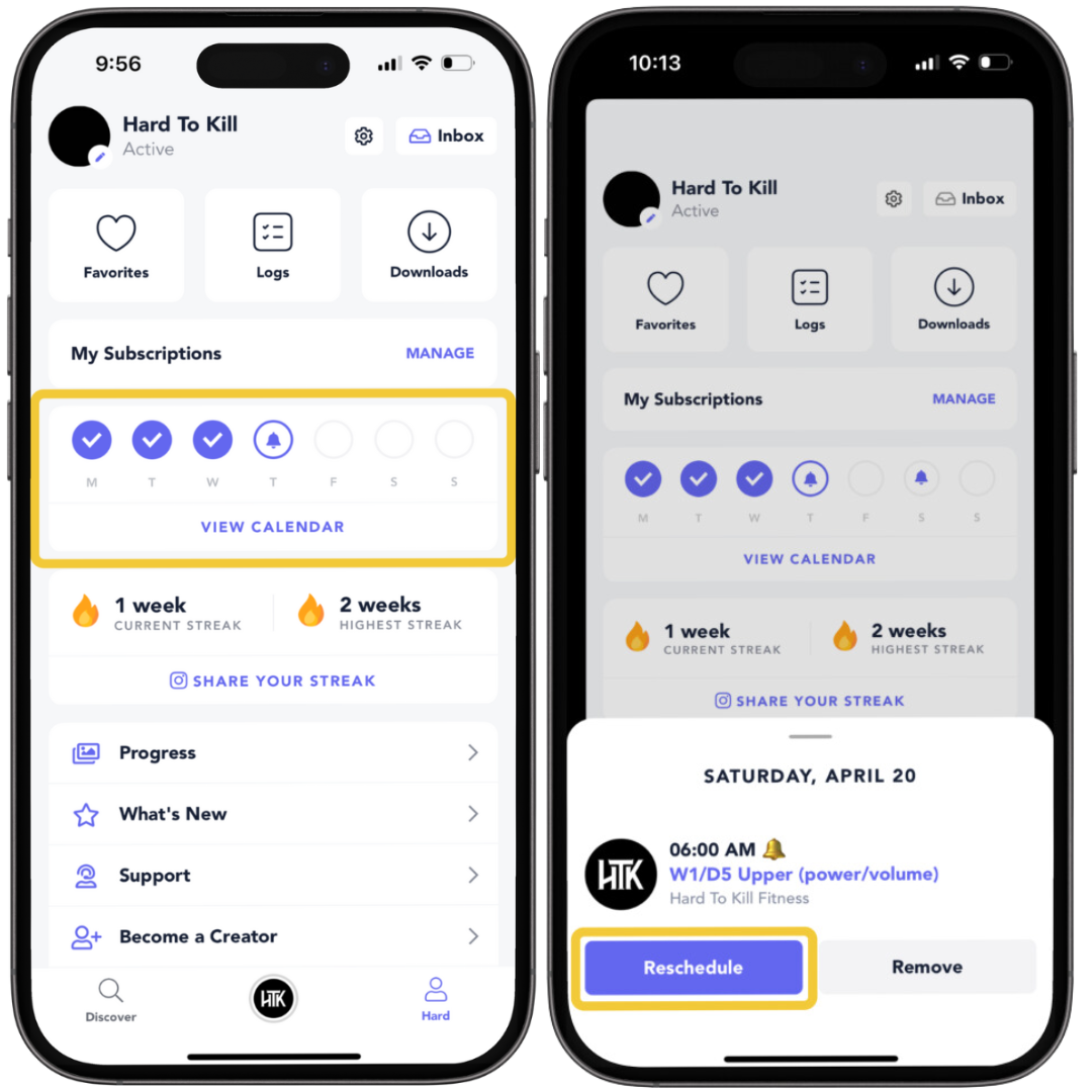 Navigate to your profile to see a quick overview of your week of workouts. From here, you can tap on the bell icon to see the workouts you have scheduled for that day. You can change it from there if you need to reschedule.