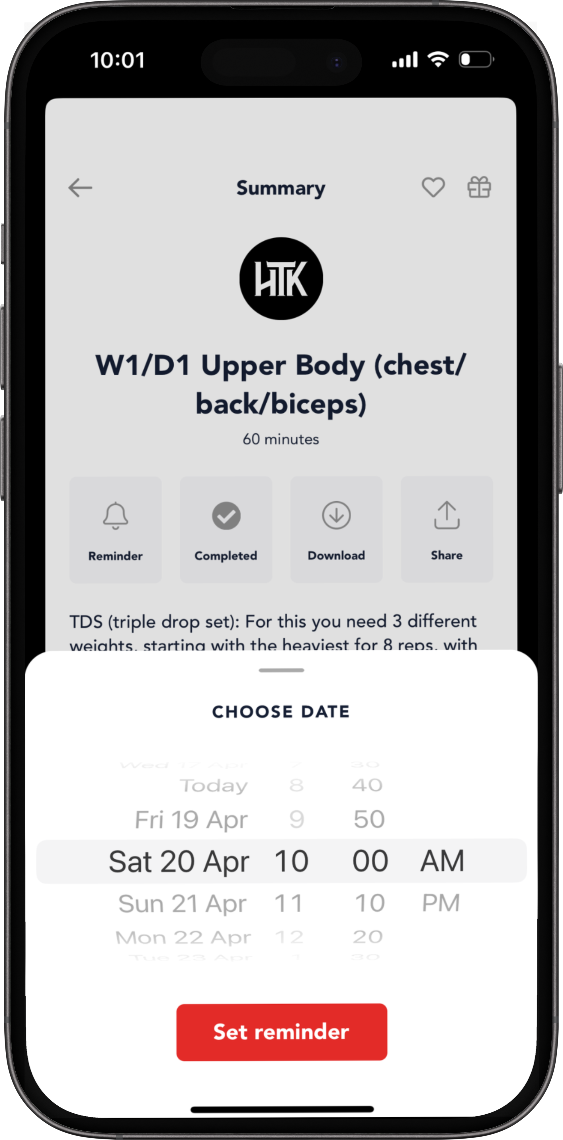 You can do this directly from your workout page. Navigate to the workout you want to add to your calendar and then tap on the reminder with the bell icon.