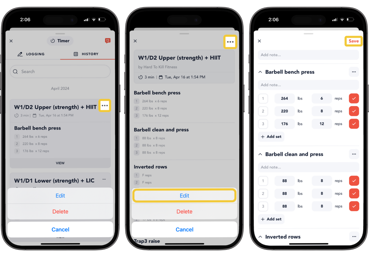 To edit your saved log, navigate to your Log History and tap the menu and select Edit. Tap Save to save your changes. The date and time on your log will not change and will be the same as the time you completed your workout.