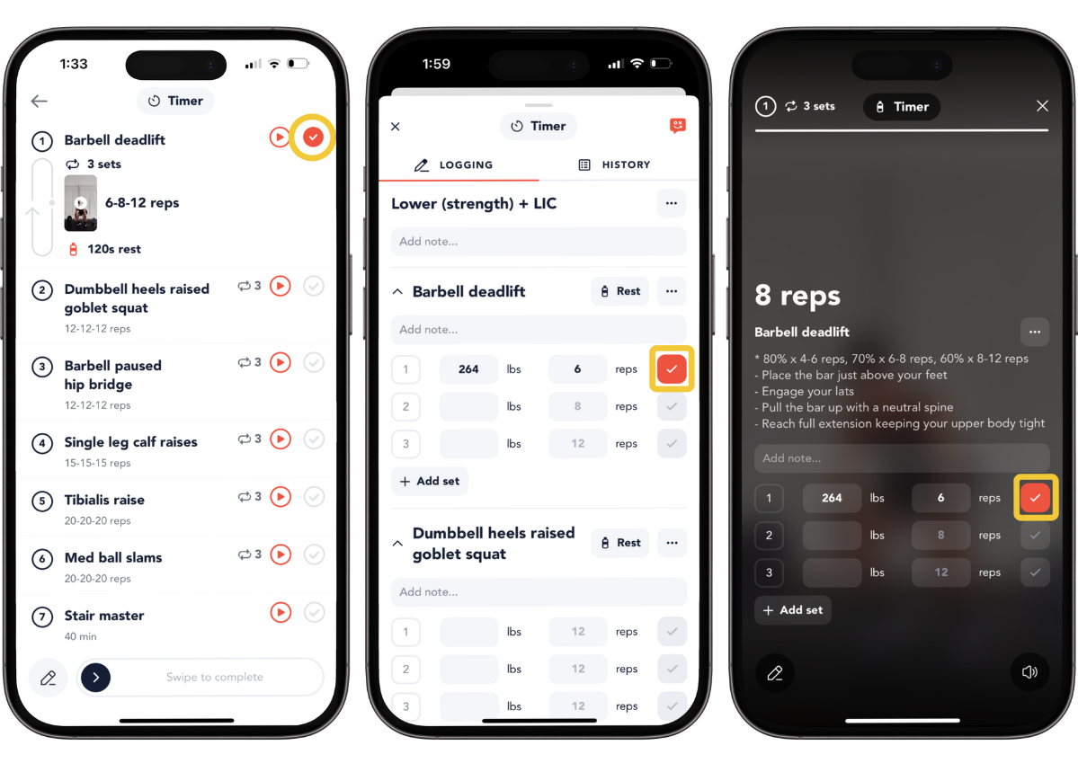 However, to save your log to your Log History and Calendar, you MUST swipe or mark the workout as complete. If you don't do this your data will be lost.