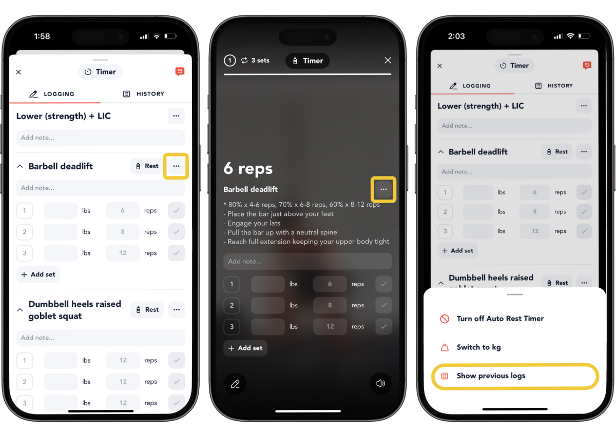 If you are in a workout and want to look up past logs to see what weight was lifted for that specific exercise, then you can tap the menu next to the exercise name. Select 'show previous logs' and you will be able to search for completed workout logs that contain that exercise.